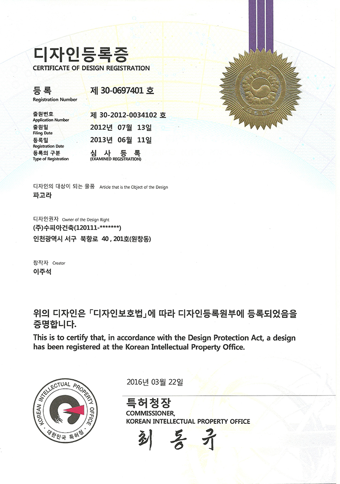 디자인등록증 3건 "파고라 디자인"